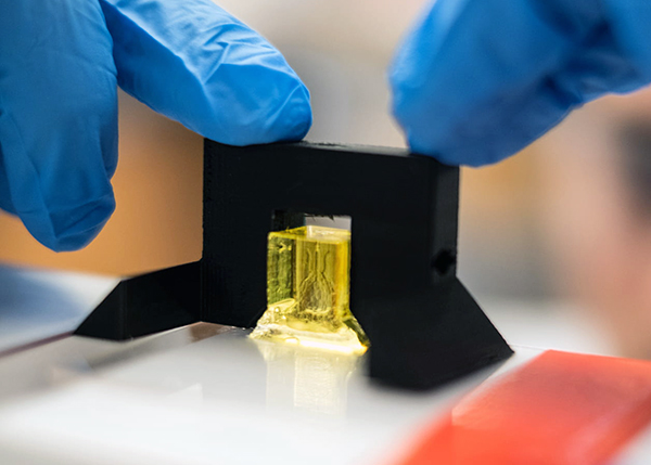 Layers are printed from a liquid pre-hydrogel solution that becomes a solid when exposed to blue light. A digital light processing projector shines light from below, displaying sequential 2D slices of the structure at high resolution, with pixel sizes ranging from 10-50 microns. With each layer solidified in turn, an overhead arm raises the growing 3D gel just enough to expose liquid to the next image from the projector. The key insight by Miller and Bagrat Grigoryan, a Rice graduate student and lead co-author of the study, was the addition of food dyes that absorb blue light. These photoabsorbers confine the solidification to a very fine layer. In this way, the system can produce soft, water-based, biocompatible gels with intricate internal architecture in a matter of minutes.